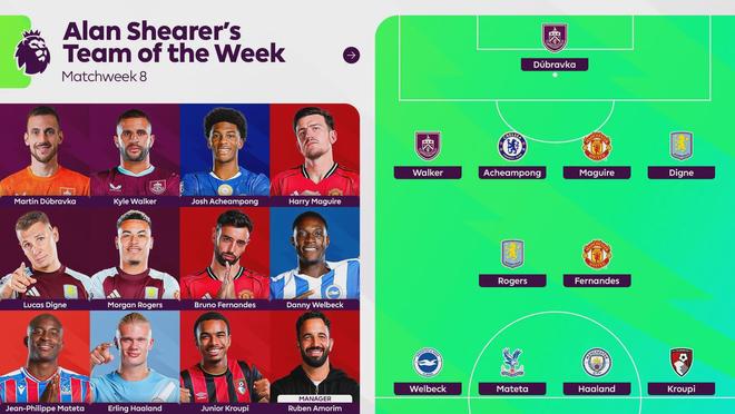 雷速体育10月22日讯 英超第8轮所有比赛已全部战罢,阿兰·希勒一如既往评选了本轮英超的最佳阵容。值得一提的是,希勒本轮评选的最佳11人,伯恩利、曼联、维拉均2人入选,而首次获得英超连胜的阿莫林被其选为本轮英超最佳主帅。
