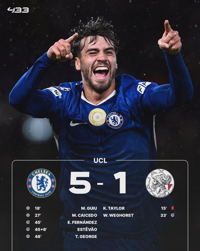 下半场,蓝军再进一球,最终他们在主场5-1大胜阿贾克斯,取得欧冠2连胜。