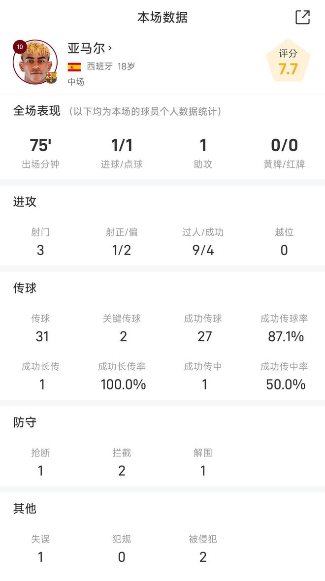 亚马尔战奥林匹亚科斯全场数据:传射建功,4次过人成功